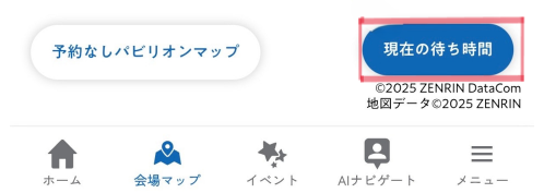 アプリを開いて→「会場マップ」→「現在の待ち時間」から確認できます。
